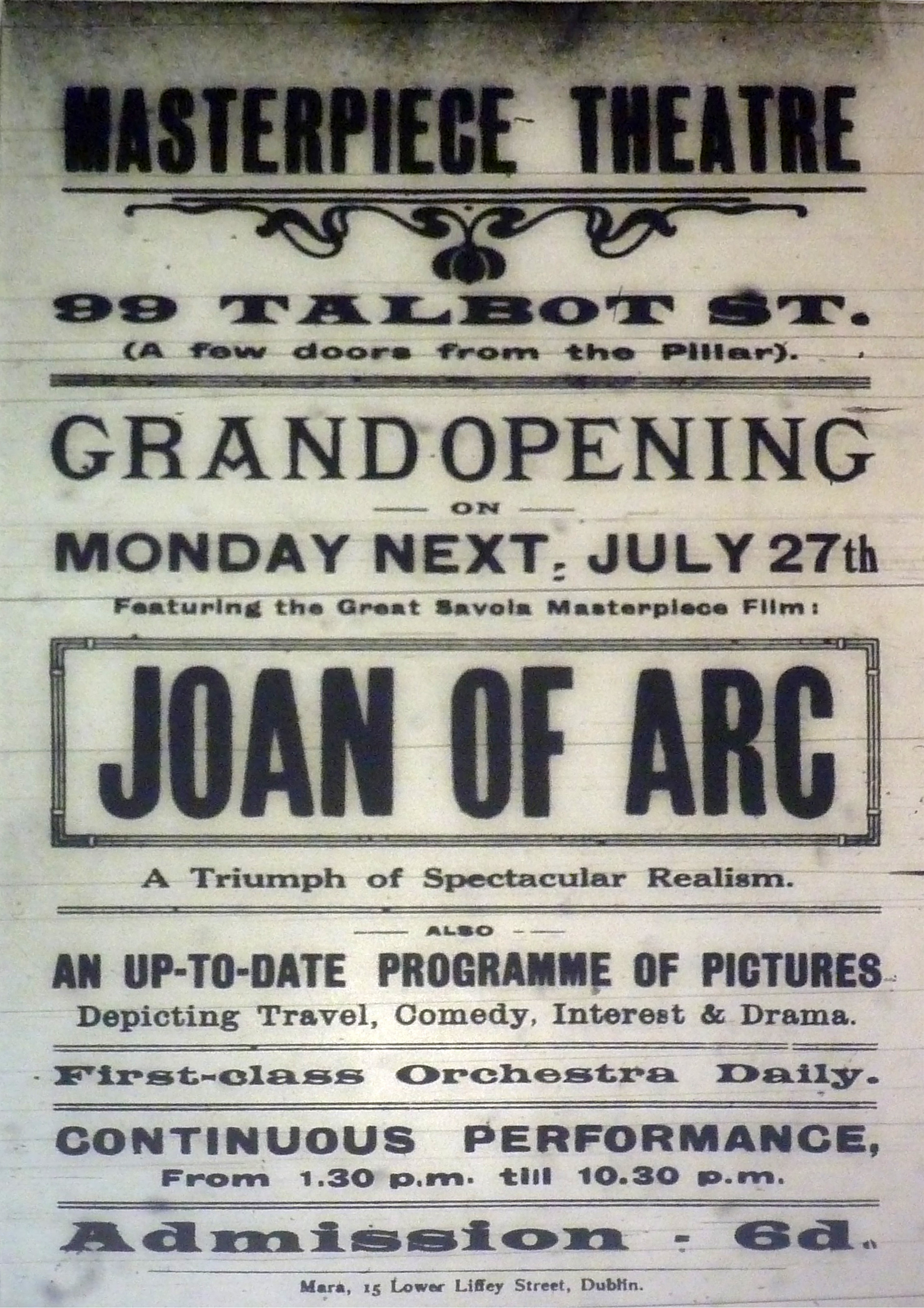 “It is ever so much more a patriotic thing to go down the quays and give the soldiers a good send-off than it is to sit in a darkened picture house watching, perhaps, ‘shadow soldiers’ flickering on a screen,” reported Paddy, the Ireland correspondent of the British cinema trade journal Bioscope in August 1914 explaining the falloff in attendance at Dublin’s picture houses at the start of the Great War. “[T]he fact that the Lord Mayor of Dublin had to publicly ask the people through the medium of the Press, to refrain from causing a block on the quays and assist in getting the soldiers embarked more expeditiously shows how matters stand” (Paddy, 13 Aug., 673). Mobilization affected the cinema and its relationship with the popular audience in various ways. Those who lined the Dublin quays, Paddy suggested, were particularly the popular audience who would otherwise have occupied the picture houses’ cheapest – usually three-penny or 3d. – seats. Although Frederick Sparling, manager of Phibsboro’s Bohemian Picture Theatre, reported brisk business, “he experienced a great falling off in the attendances at the 3d. seats, and he expected that receipts generally would show a drop for a little time” (ibid).