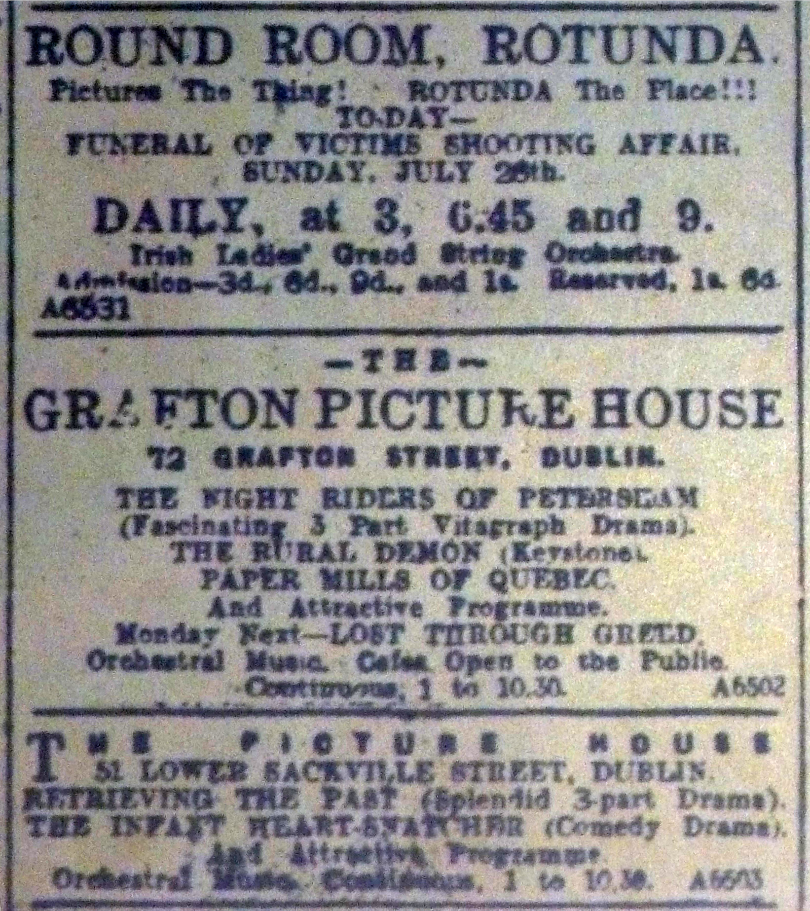 Nevertheless, Irish picture houses attempted from a very early point in the war to provide shadow soldiers on the screen for their audiences, and not only working-class ones. On 7 August 1914, the Dublin Evening Mail carried the first of a series of unusually large ads for the Picture House, Grafton Street and the Picture House, Sackville Street showing films depicting “the latest developments of the War, day by day.” Both of these cinemas were owned by the London-based chain Provincial Cinematograph Theatres, which also ran the less-salubrious Volta in Mary Street and Belfast’s Picture House, Royal Avenue. The company promoted its venues – and particularly the recently renovated and extended Grafton on Dublin’s most prestigious shopping street – as offering luxuries suitable for prosperous city-centre shoppers. Strollers who stopped into the Grafton’s public café might be induced to see the war pictures by a sign that indicated which of the six-to-eight films typically on a cinema programme was currently playing in the auditorium.