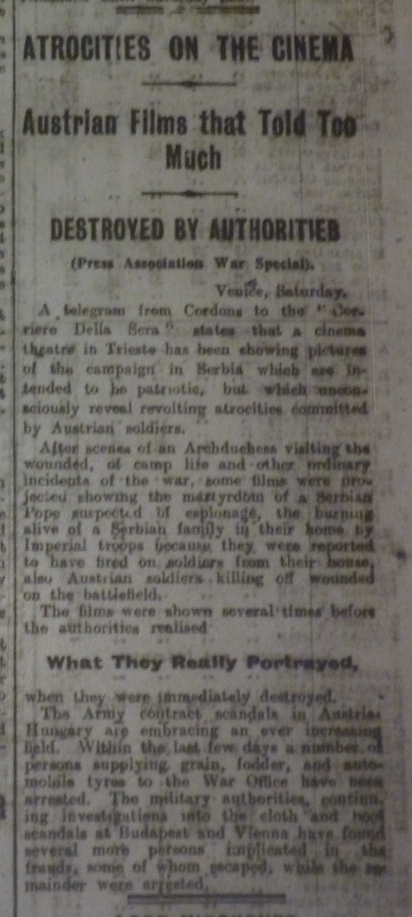 “Atrocities on the Cinema: Austrian Films that Told Too Much: Destroyed by Authorities.” Dublin Evening Mail 27 Mar. 1915: 5.