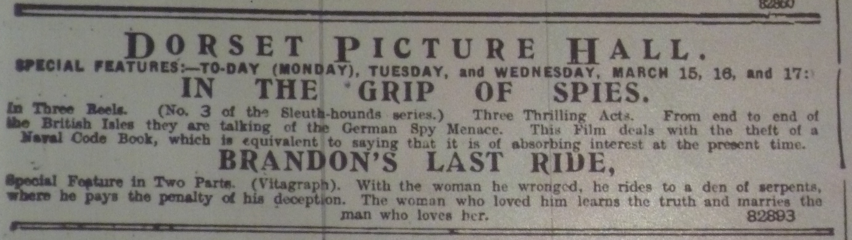 What is interesting, though, is that the expression by an Irishman of such anti-British sentiments led him to be labelled a spy. Indeed, this story fitted into a discourse on spies and spying spread by newspapers and other popular media including the cinema that dovetailed with the British government’s war policies (see also, for example, in same issue of Evening Telegraph “Imaginary Spy” and “Danger of Spies”). For three days in mid-March, Dublin’s Dorset Picture Hall showed In the Grip of Spies (Britain: Big Ben, 1914), and this title offers an apt description of the state of fear of “the enemy among us” that this discourse aimed to spread. “From end to end of the British Isles they are talking of the German Spy menace,” a press ad claimed. “This Film deals with the theft of a naval Code Book, which is equivalent to saying that it is of absorbing interest at the present time” (ibid). But spying was also a suitable subject for comedy, with patrons at the Picture House, Sackville/O’Connell Street enjoying Wiffles Catches a Spy (France: Pathé, 1915).