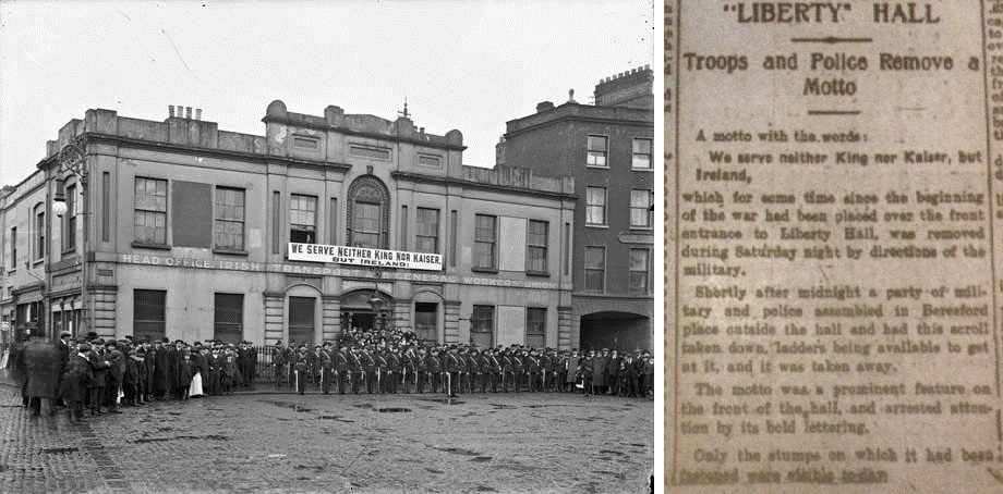 “‘Liberty’ Hall: Troops and Police Remove a Motto.” Evening Herald 21 Dec. 1914: 1.