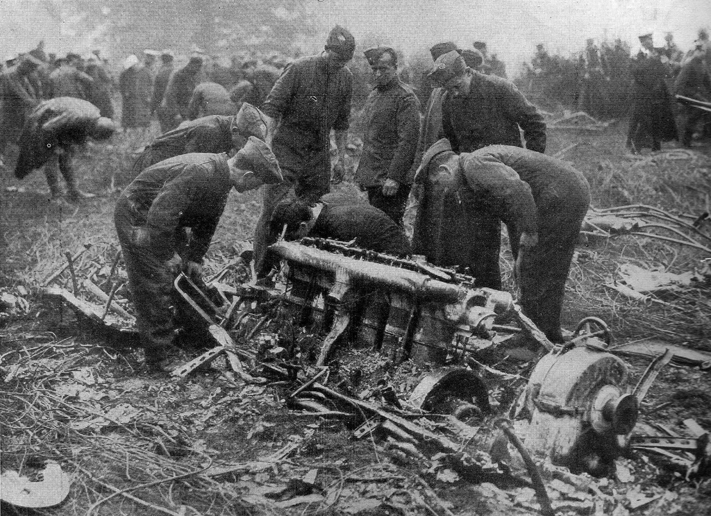 British military personnel sift through the wreckage of Airship SL11, shot down near Cuffley, Hertfordshire, on 3 September 1916. Image from Europeana.