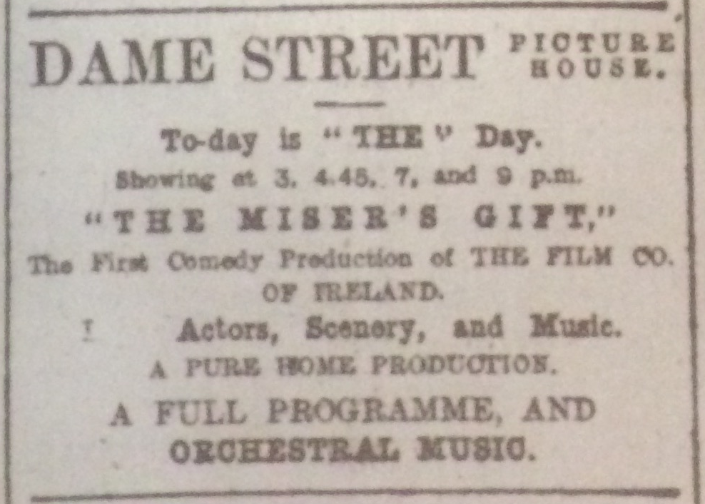 After The Miser’s Gift, the Dame Street Picture House became the cinema that premiered the Film Company of Ireland’s productions. Dublin Evening Mail 26 Oct. 1916: 2