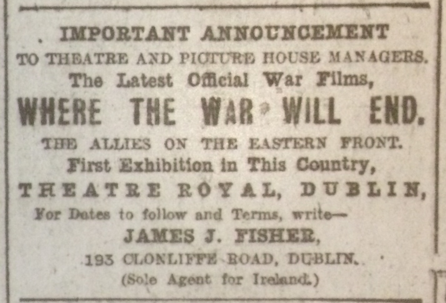 James J. Fisher was the Irish agent for the official war films; Dublin Evening Mail 31 Oct. 1916: 2.