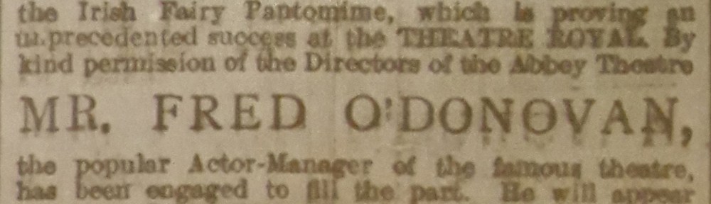Ad announcing that Fred O’Donovan was replacing Dermot O’Dowd in Finn Varra Maa’s key role of Caoilte; Dublin Evening Mail 2 Jan. 1918: 2.