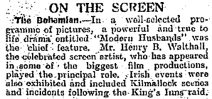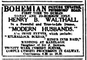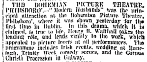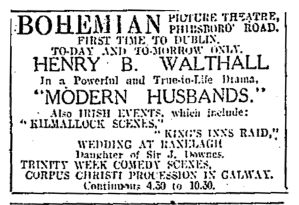 During the week of 7-12 June 1920, ads and brief notices for the Bohemian Picture Theatre in Phibsboro, Dublin offered an unusual amount of detail on the latest issue of the Irish Events newsreel. The newsreel was part of the programme supporting the Bohemian’s main feature, Modern Husbands (US: National, 1919), starring Henry B. Walthall, and Walthall’s name and that of the film dominate the text of the ad, as expected, but the bottom part of the ad is taken up completely with a description of the items making up week’s Irish Events.