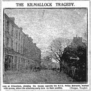 “Scene at Kilmallock, showing the houses opposite the R.I.C. Police Barracks, marked with arrows, where the attacking party took up their positions.” The photo is attributed to Horgan, the photographers and cinema owners in Youghal, Co. Cork. Freeman’s Journal 31 May 1920: 3.
