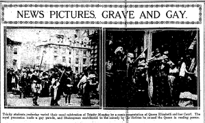 Trinity students yesterday varied their usual celebrations of Trinity Monday by a comic representation of Queen Elizabeth and her Court. The royal procession made a gay parade, and Shakespeare contributed to the comedy by the distress he caused the Queen in reading poems. Irish Independent 1 Jun. 1920: 3.