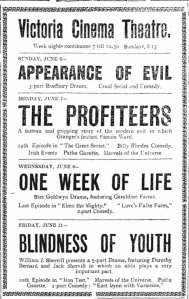 The programme at Galway’s Victoria also included Irish Events supporting the Monday feature The Profiteers (US: Astra, 1919), where it also shared the bill with the 14th episode of The Great Secret (US: Quality, 1917) serial, an unnamed Billie Rhodes comedy, Pathé Gazette and Marvels of the Universe (US: Bray, 1920). Connacht Tribune 5 Jun. 1920: 4.