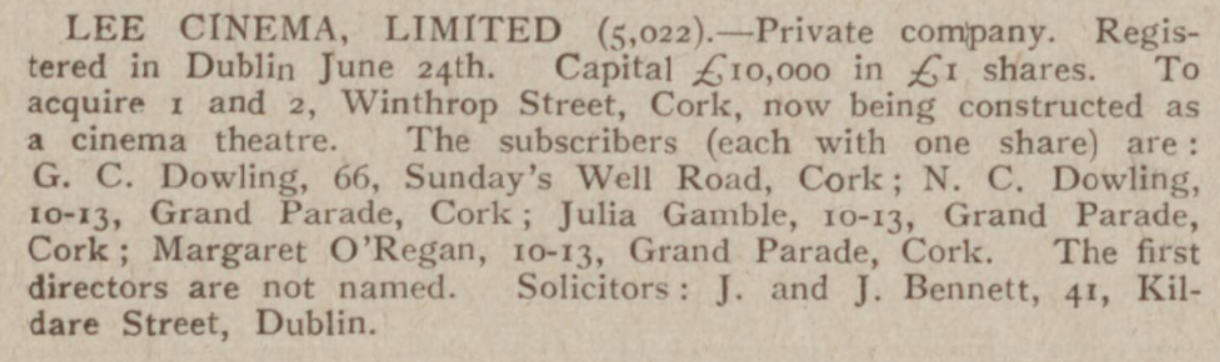 The destruction of the Lee just weeks after it opened at the start of November might be symbolic of Irish cinema’s fade out in 1920, but many more cinemas opened in 1920 than were closed either in this dramatic fashion or for more mundane commercial reasons. Cork began the year with the opening of Washington Street Cinema on 15 January but was particularly well served with suburban cinema openings in autumn 1920, with both the Blackpool on the Watercourse Road and Bellvue on Military Road opening on the same day, 25 October, a week before the Lee. The lavish Pavilion on Patrick Street was still under construction at the end of the year and would open in March 1921. In Sligo, the Boyne Cinema Company may have claimed the first opening of the year, when it offered film shows in the Assembly Room of the Town Hall. The Kilgannon family, who ran the Sligo Picture Theatre on Thomas Street closed the year by launching the Pavilion just metres away in the same street on Christmas day. Early summer saw several opening in Dublin: 10 May saw the opening of both the Manor Cinema on Manor Street and the Lyceum Picture Theatre at the renovated Volta premises at 45 Mary Street; on 13 May, the Palace Cinema opened in the remodelled Antient Concert Rooms on Brunswick Street. Autumn in Dublin saw the Theatre de Luxe open on Camden Street on 4 September and the AOH Hall at 31 Parnell Square begin screening on 4 October. Elsewhere, Limerick’s Garryowen opened on 5 March on Broad Street; the Abbeyfeale Cinema opened in mid-May; Wicklow’s Excelsior became that town’s first cinema on 14 December; and ironmonger Michael Connolly opened a cinema at his premises in Ballymahon, Co. Longford over the Christmas season.