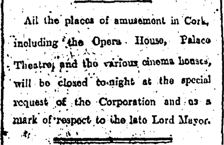 Violence by crown forces was the most prevalent, destructive and disruptive of cinemagoing, but Republicans also sought to control cinema and even attacked cinemas and cinemagoers. The Irish Independent reported that on 12 June 1920, what it called the “Republican secret service” arrested fifteen boys aged between 14 and 18 for committing robberies in Cork, and the Sinn Fein court’s prosecutor recommended that the Corporation take measures “to prevent children attending pictures, except on specified nights, when pictures tending to educate and to elevate the minds of the boys would be shown” (“Irish Volunteers’ Activity”). On 14 August, Cork papers reported that in the absence of the recently arrested Lord Mayor Terence MacSwiney, the Corporation had passed a resolution calling on the Irish Republican Government to introduce film censorship (“Cork Town Council”). When cinemas closed on 29 October as a mark of respect and protest at MacSwiney death on hunger strike in Brixton Prison, some closures were enforced by the local Voluneers/IRA. The Irish Independent reported that the Dungannon picture house had closed at the request of the Volunteers, who had also stopped several dances (“Dances Stopped”). “A school teacher returning to his home in the village of Crossgar, Downpatrick,” the Irish Times revealed in relation to the same event, “was seized by a number of men who cut off his hair because he attended a performance at the local picture cinema theatre which Sinn Feiners desired to have closed owning to the death of the Lord Mayor of Cork” (“Incidents in the Provinces”).