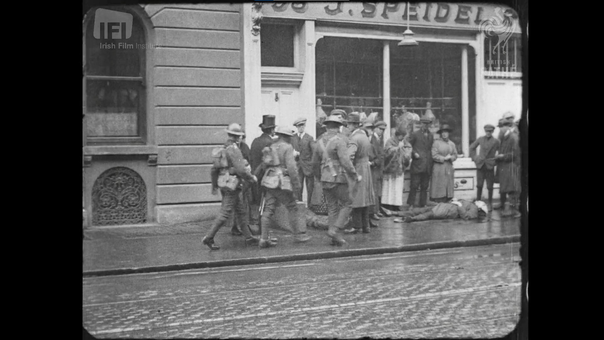 A cameraman from Irish Events was also quickly on the scene on Dublin’s Talbot Street on 14 October following a shoot-out between of IRA activist Seán Treacy and British soldiers and secret service agents that left Treacy and two of the secret service agents dead. The film survives and can be viewed on the IFI Player, including the scene that Evening Herald “Flickers from Filmland” columnist drew particularly attention to, of “the crowd running from the menace of further shooting, and the still group of victims on the footway, [which] makes a most unusual contribution to film history” (“Flickers from Filmland”).