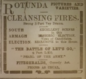 The Telegraph’s assessment of 1920 has also been reflected in this blog, which began the year hopeful by contemplating the opening of super cinemas but became less positive almost immediately not because of pandemic – although it did revisit the 1918-19 flu pandemic – but because the violence of the War of Independence was starting to affect such daily activities as cinema. While the blog spent much of the middle of the year discussing such more positive developments as the making of feature films (see here and here) and newsreels, encroaching violence became an increasing feature of the 1920 cinema year and will require more discussion here.