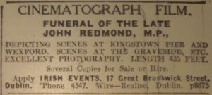 A cameraman from Irish Events was also quickly on the scene on Dublin’s Talbot Street on 14 October following a shoot-out between of IRA activist Seán Treacy and British soldiers and secret service agents that left Treacy and two of the secret service agents dead. The film survives and can be viewed on the IFI Player, including the scene that Evening Herald “Flickers from Filmland” columnist drew particularly attention to, of “the crowd running from the menace of further shooting, and the still group of victims on the footway, [which] makes a most unusual contribution to film history” (“Flickers from Filmland”).