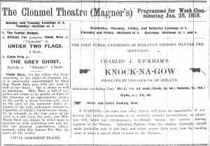 Writing a centenary blog in 2020 presented some challenges, the main one being that the blogs written after February had to rely solely on online research rather than visits to the National Library of Ireland (NLI) and other archives. This has had consequences for the range of sources used, and for the quality of obtainable images. Some freely accessible online sources for Irish cinema history exist, including films from the Irish Film Institute’s IFI player, the 1901 and 1911 Irish censuses, photographs from the NLI and maps from the Ordnance Survey of Ireland. Most other online sources require a subscription, including newspapers and trade journals, which provide the most detailed information. A selection of Irish newspapers has been digitized through two main subscription services: the Irish Newspaper Archive and the British Newspaper Archive (BNA). Both allow access to the Freeman’s Journal’s twice-weekly column “On the Film,” which fills some of the gaps left by the inaccessibility of analogue sources. Late in 2020, the BNA also released its digitization of the Kinematograph and Lantern Weekly, making its information on Irish cinema available alongside other key London-based entertainment trade journals the Bioscope and the Era. Sadly, the issues of The Irish Limelight for 1920 do not survive in digital or analogue form, and when editor Jack Warren handed this first Irish cinema journal over to contributor P.J. Flanagan at the end of 1920, it seems to have ceased publication (“Trade in Ireland”).