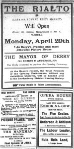Violence by crown forces was the most prevalent, destructive and disruptive of cinemagoing, but Republicans also sought to control cinema and even attacked cinemas and cinemagoers. The Irish Independent reported that on 12 June 1920, what it called the “Republican secret service” arrested fifteen boys aged between 14 and 18 for committing robberies in Cork, and the Sinn Fein court’s prosecutor recommended that the Corporation take measures “to prevent children attending pictures, except on specified nights, when pictures tending to educate and to elevate the minds of the boys would be shown” (“Irish Volunteers’ Activity”). On 14 August, Cork papers reported that in the absence of the recently arrested Lord Mayor Terence MacSwiney, the Corporation had passed a resolution calling on the Irish Republican Government to introduce film censorship (“Cork Town Council”). When cinemas closed on 29 October as a mark of respect and protest at MacSwiney death on hunger strike in Brixton Prison, some closures were enforced by the local Voluneers/IRA. The Irish Independent reported that the Dungannon picture house had closed at the request of the Volunteers, who had also stopped several dances (“Dances Stopped”). “A school teacher returning to his home in the village of Crossgar, Downpatrick,” the Irish Times revealed in relation to the same event, “was seized by a number of men who cut off his hair because he attended a performance at the local picture cinema theatre which Sinn Feiners desired to have closed owning to the death of the Lord Mayor of Cork” (“Incidents in the Provinces”).