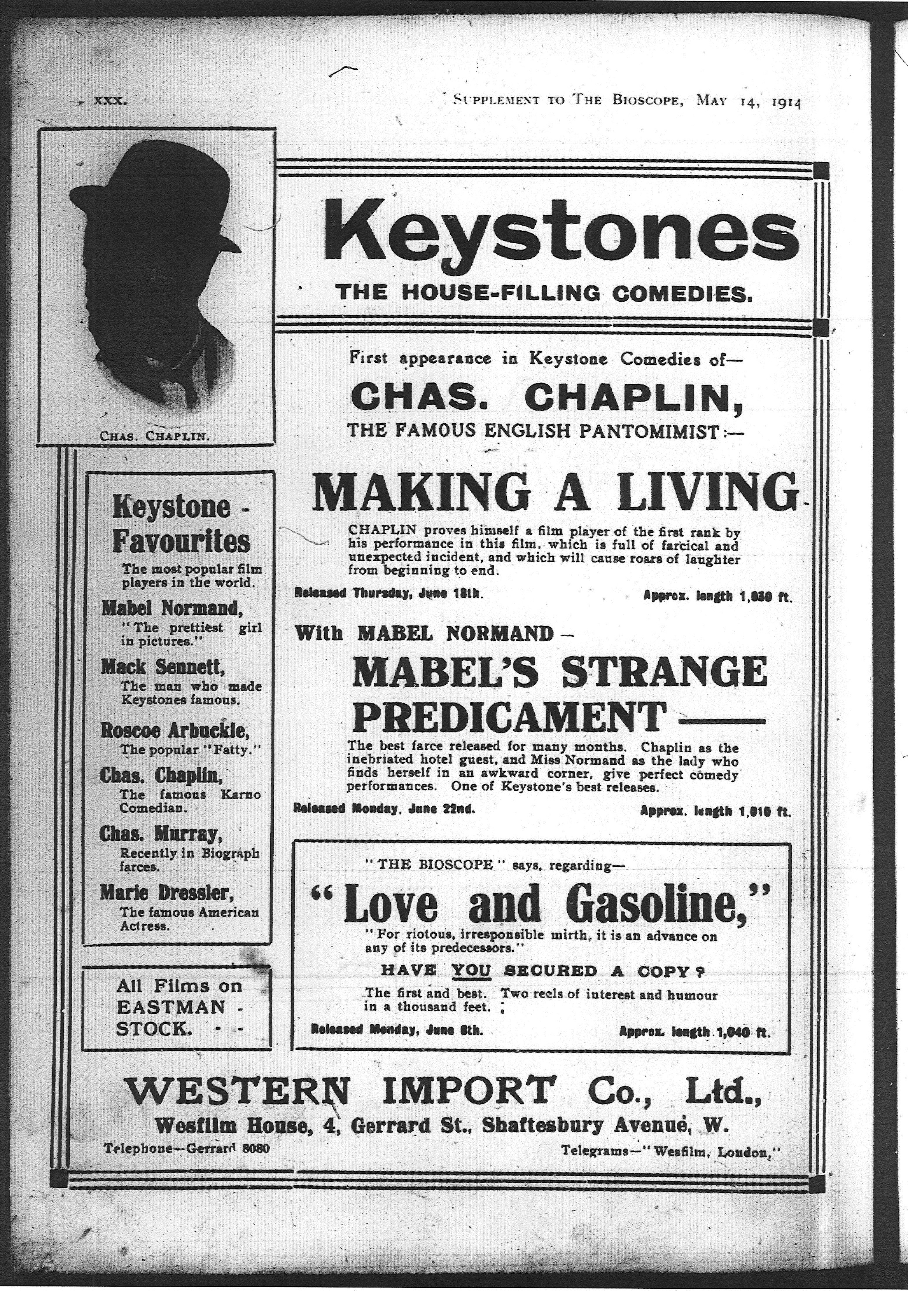 Bioscope ad for Keystone that includes for the first time an image of Chaplin, “the famous English pantomimist”; 14 May 1914: xxx.
