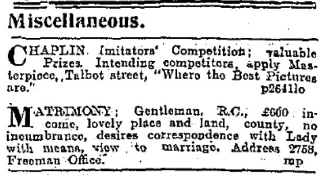 Small ad calling for Chaplin imitators. Freeman's Journal 16 Sep. 1915: 8.