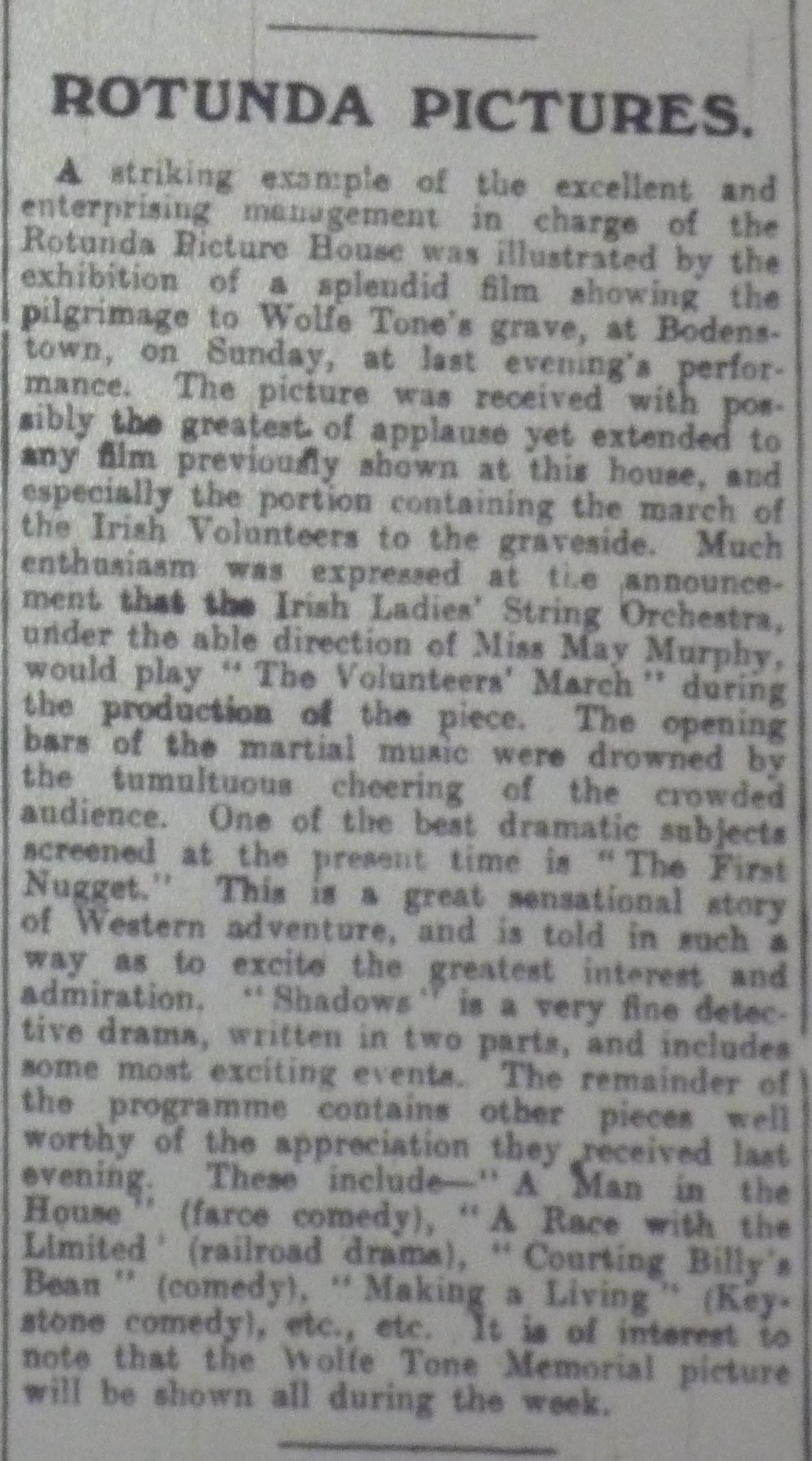 Review of the Rotunda programme that mentioned the rapturous reception of the political film The Annual Pilgrimage to Wolfe Tone's Grave; Evening Telegraph 23 Jun. 1914: 2.